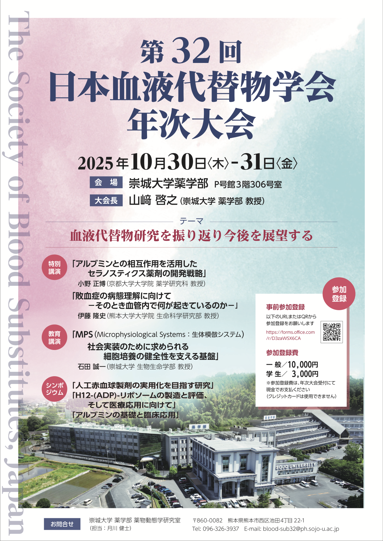 崇城大学薬学部薬物動態学研究室(担当:月川 健士) 〒860-0082 熊本県熊本市西区池田4丁目22-1 Tel: 096-326-3937 E-mail: blood-sub32@ph.sojo-u.ac.jp |